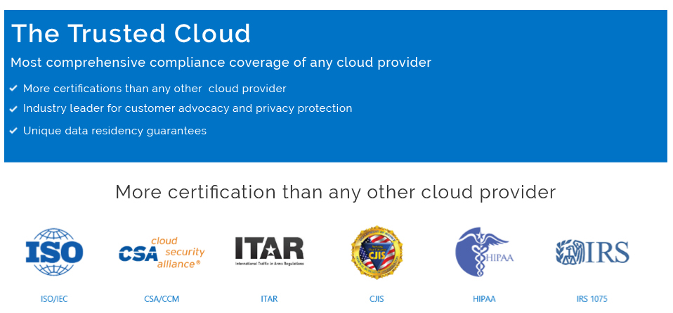 Azure has been recognized as the most trusted cloud for U.S government institutions, which also includes a FedRAMP High authorization covering 18 Azure services. It offers the most comprehensive compliance coverage with over 50 compliance offerings.